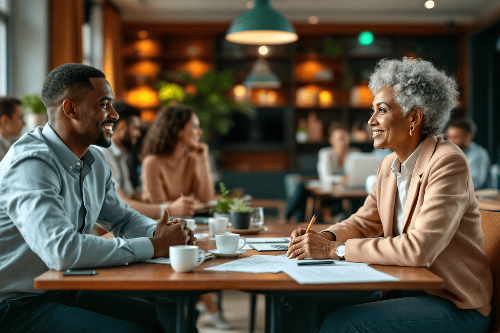 휠체어를-탄-장애인과-그에게-웃으며-서류를-보여주는-여성