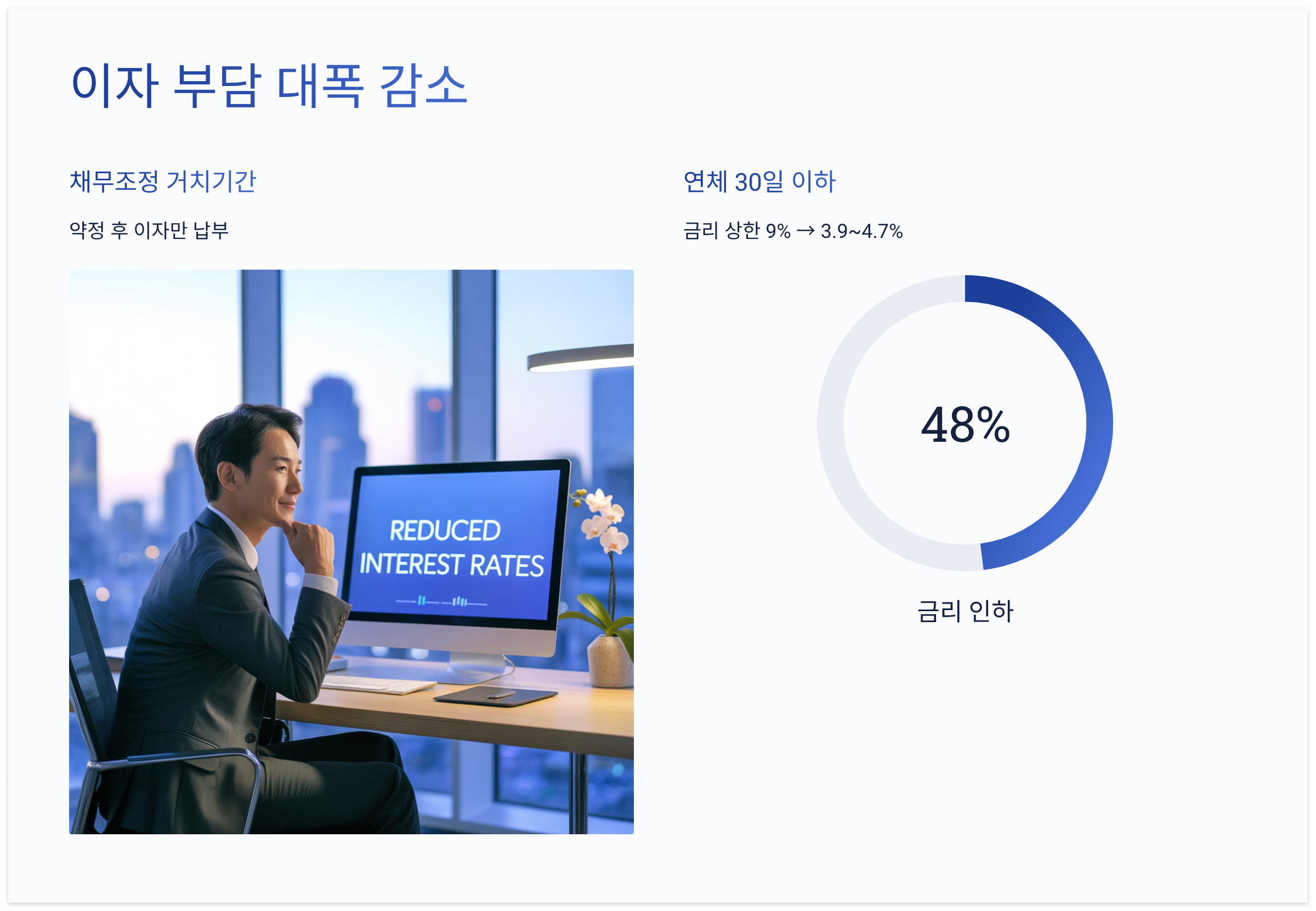 - 거치기간 동안 채무조정 전 이자 → 조정 후 약정이자만 납부
