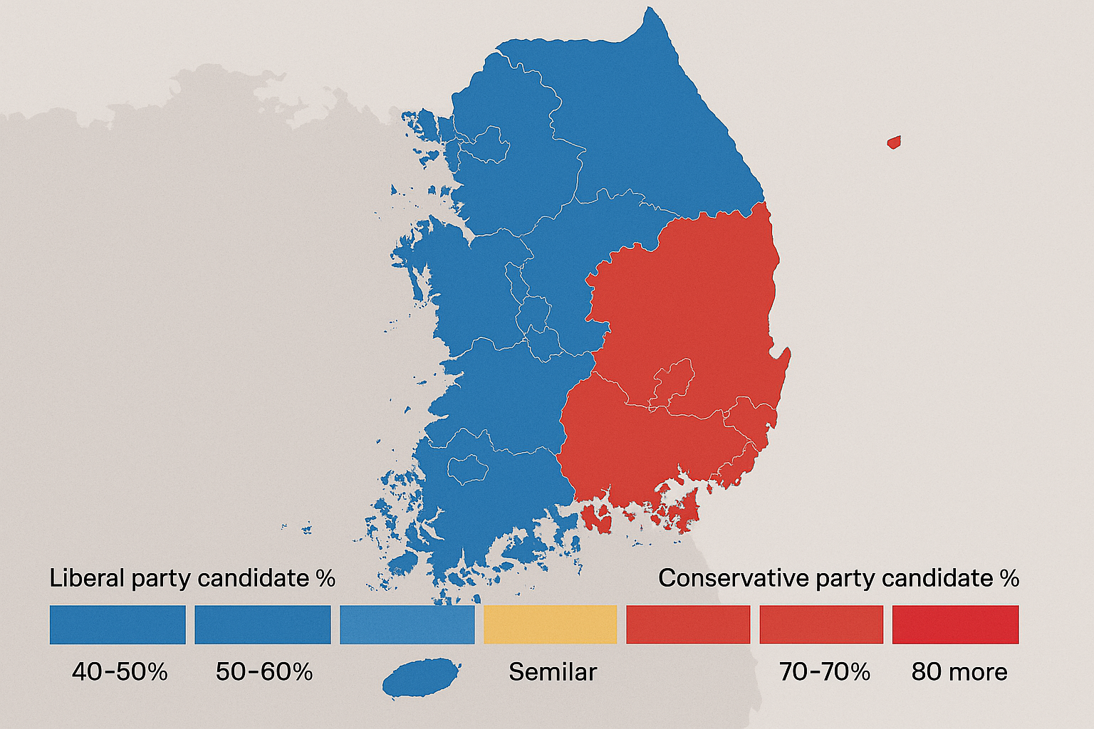 1. 지역주의 여전: PK(부산·경남), TK(대구·경북)는 국민의힘 기반, 광주·전남·전북은 민주당 성향