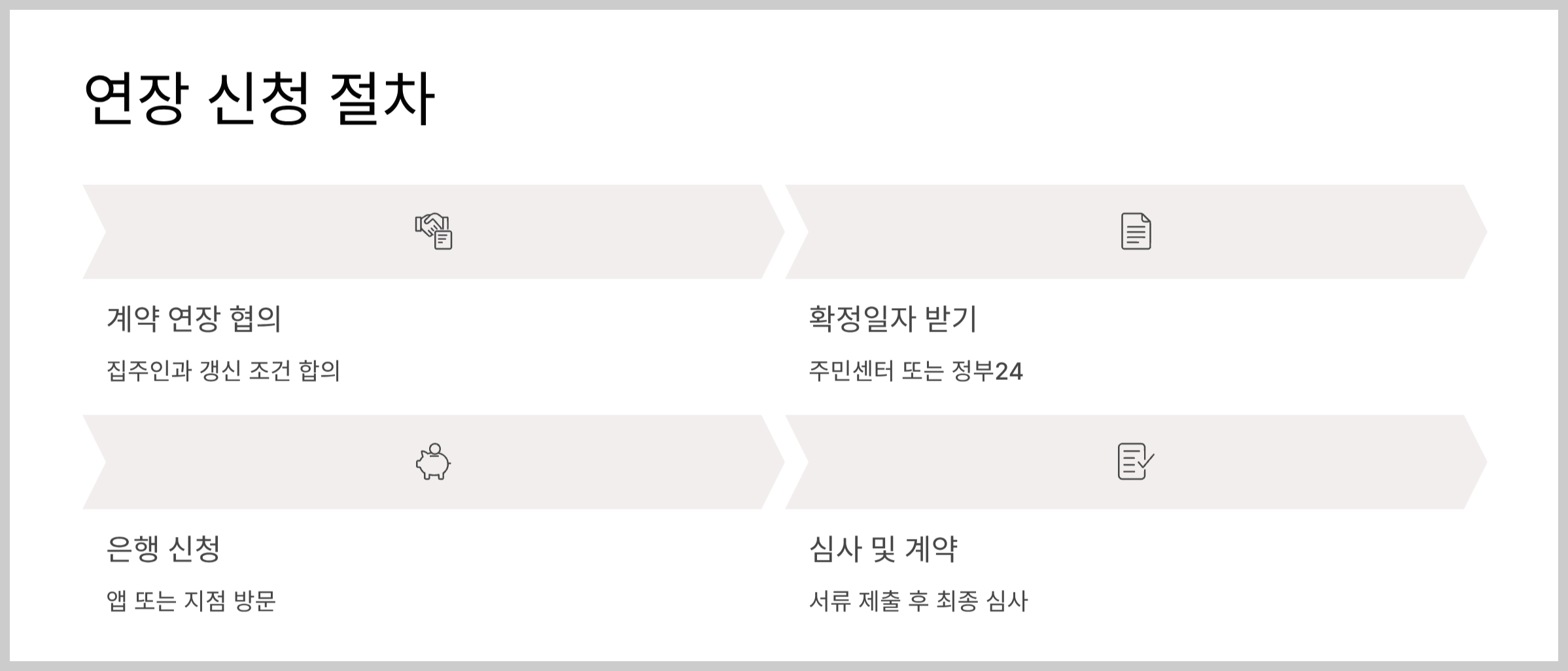 - 연장 신청은 만기 1개월 전부터 2주 전까지 - 소득·자산·신용 요건 유지 필수 - 계약서 확정일자 꼭 받기