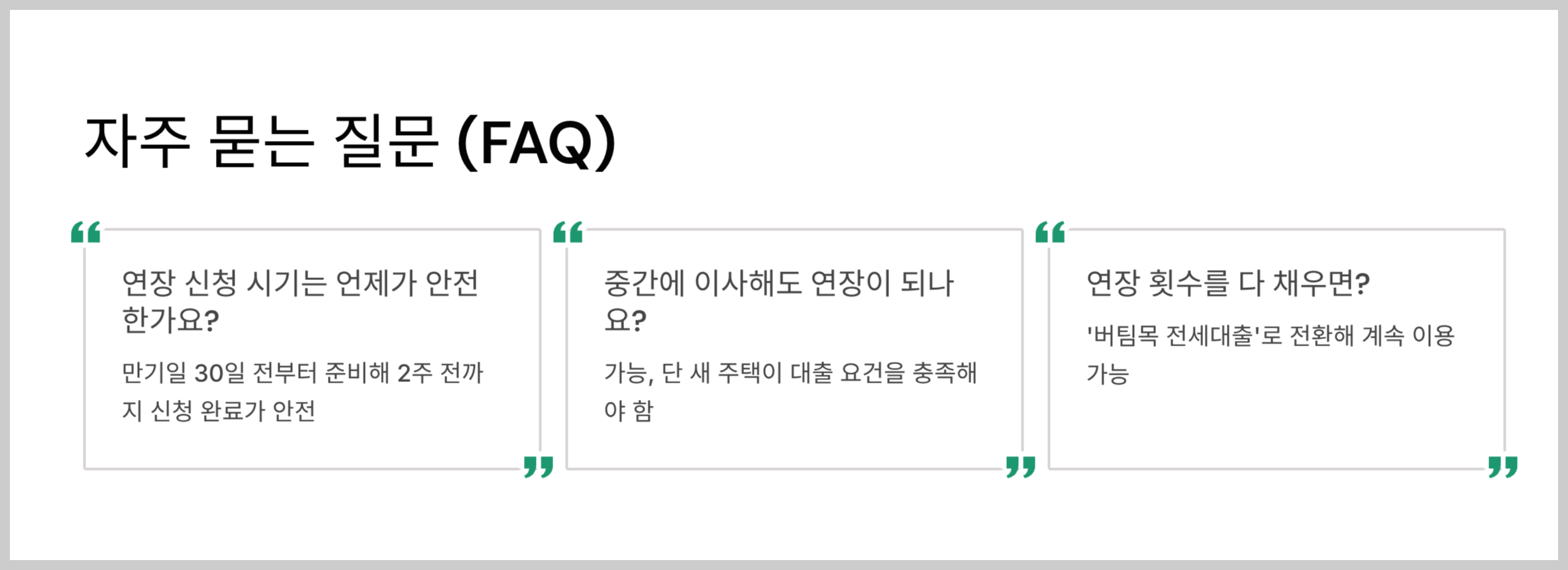 - 연장 신청은 만기 1개월 전부터 2주 전까지 - 소득·자산·신용 요건 유지 필수 - 계약서 확정일자 꼭 받기