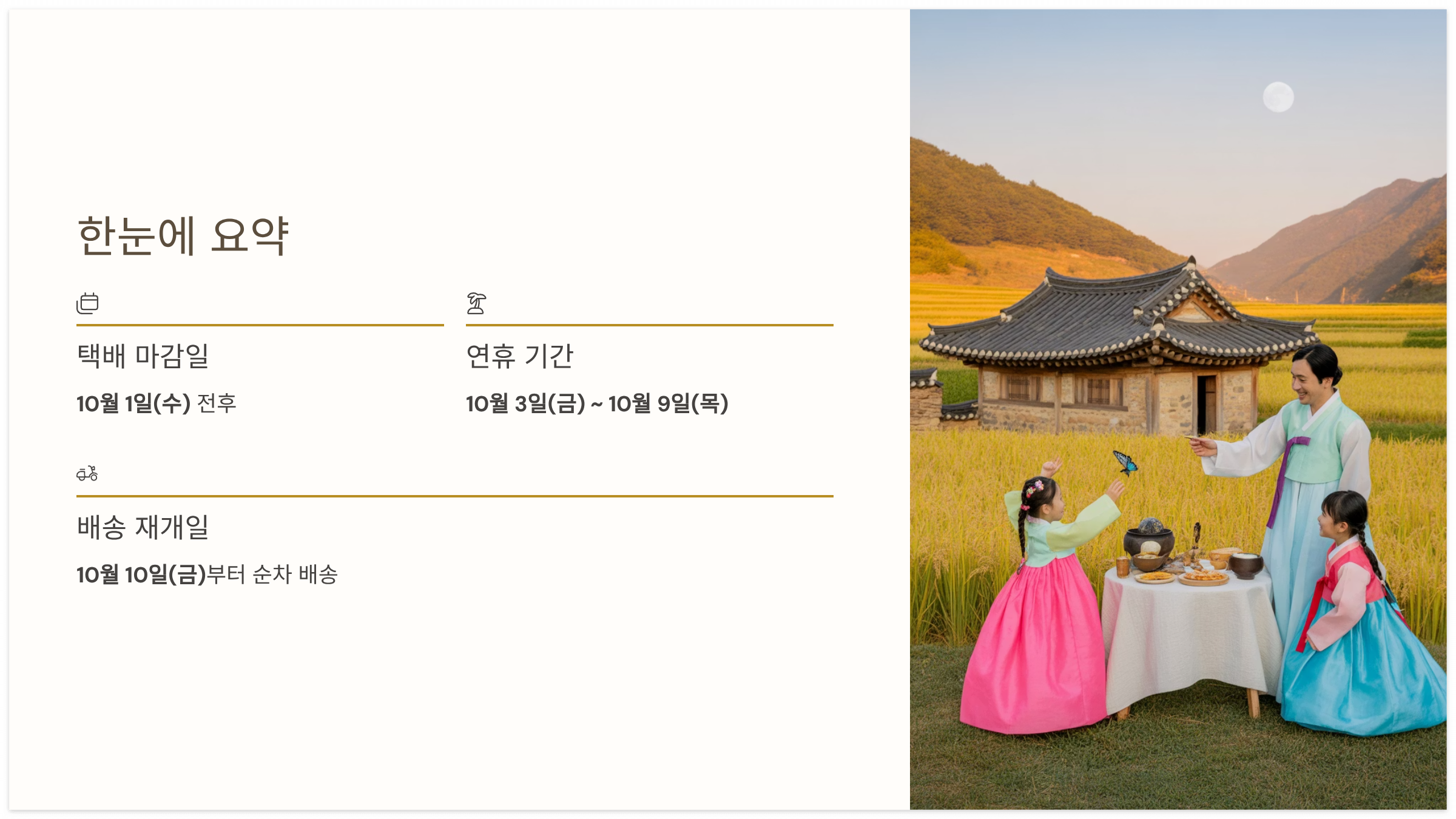 - 연휴 기간(10월 3일~9일)에는 택배 접수와 배송이 사실상 중단됩니다.