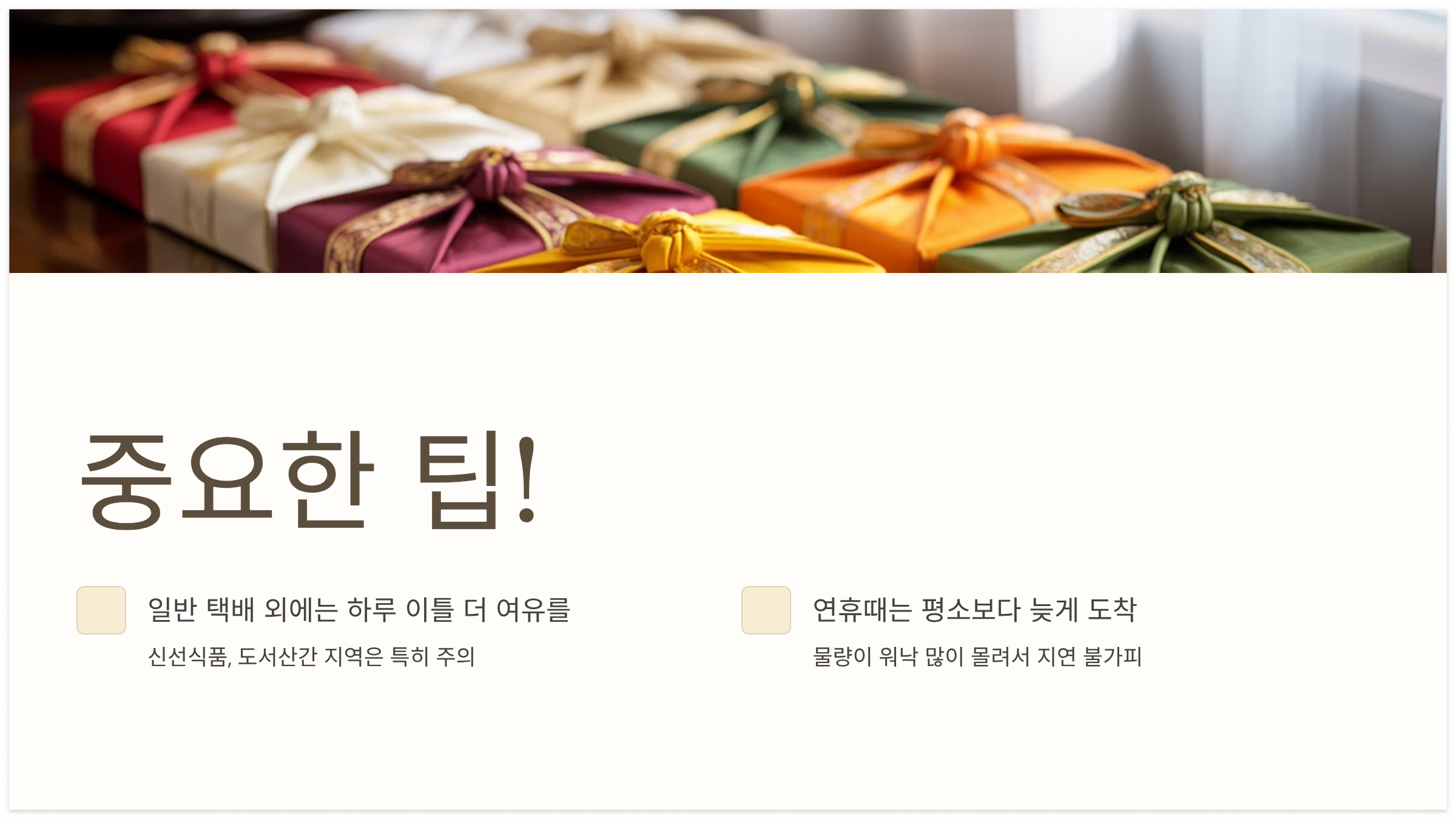 연휴 시작 전후로는 물량이 몰려 배송 지연이 발생하기 쉽기 때문에, 마감일을 꼭 체크해야 합니다.