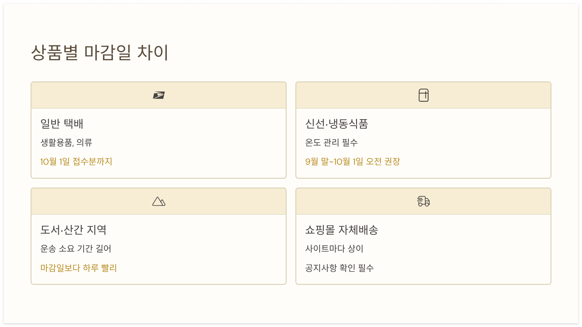 - 도서·산간 지역 → 운송 기간이 길어 일반 지역보다 하루 먼저 마감
