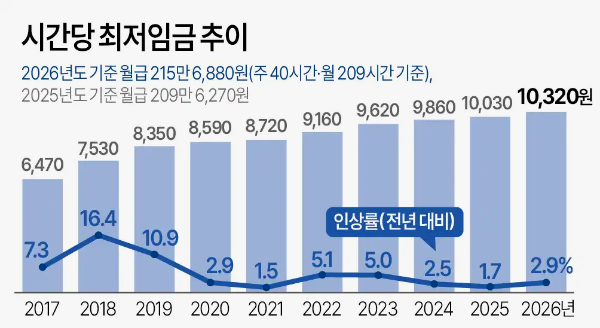 2026년 최저임금이 시간당 10,320원으로 확정됐습니다. 작년보다 290원 오른 금액이며, 인상률은 2.9%입니다.