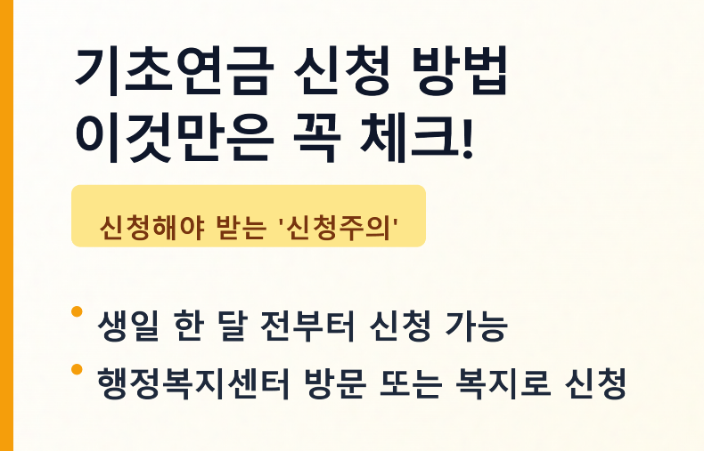 기초연금은 '신청주의'입니다. 국가가 알아서 주는 것이 아니라, 내가 신청해야만 받을 수 있습니다. 특히 생일이 지난 달부터 바로 지급되니 하루라도 빨리 움직이시는 것이 이득입니다.