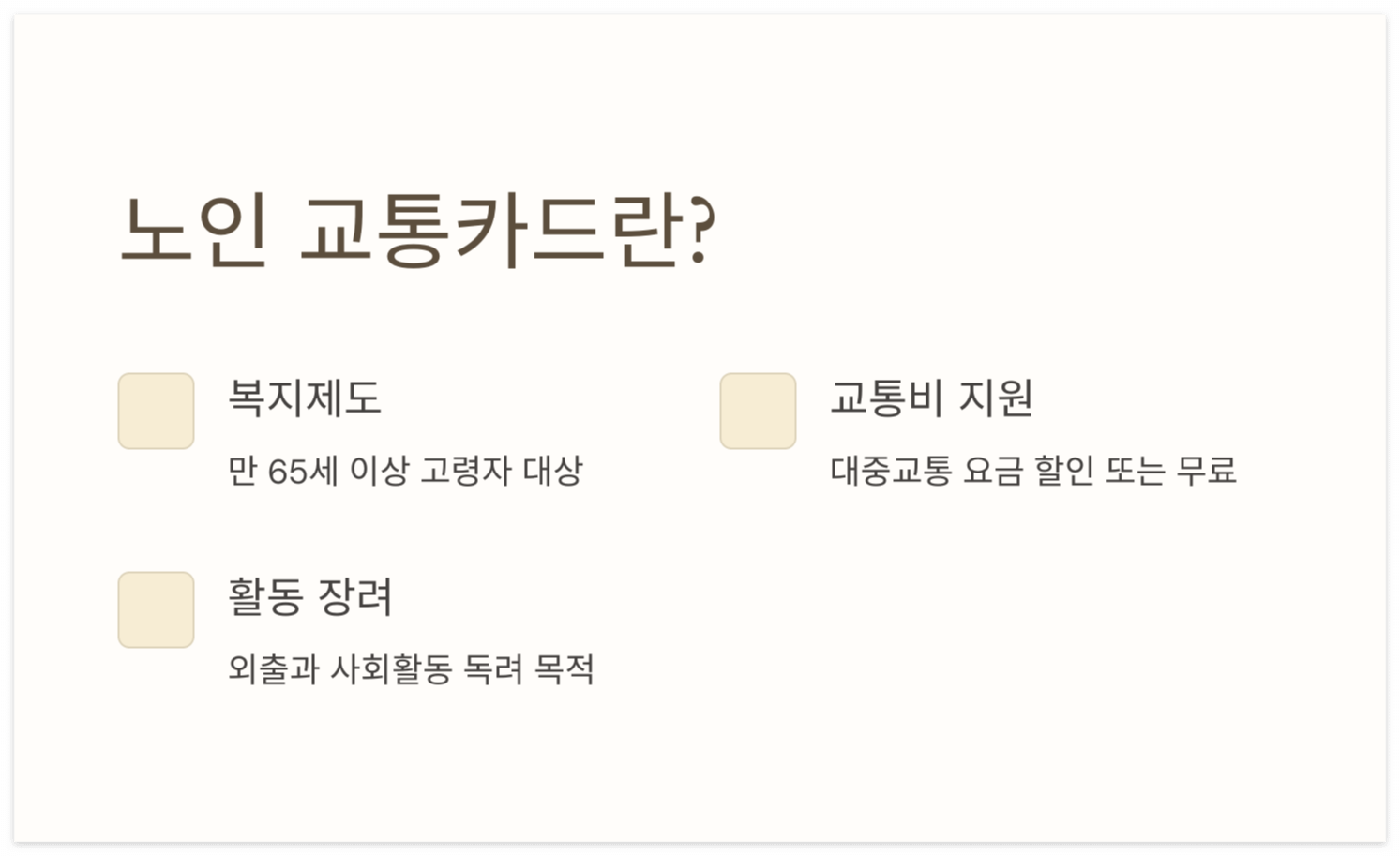 교통비 부담을 줄이고, 외출과 사회 활동을 독려하기 위한 정부 및 지자체 지원 제도입니다.