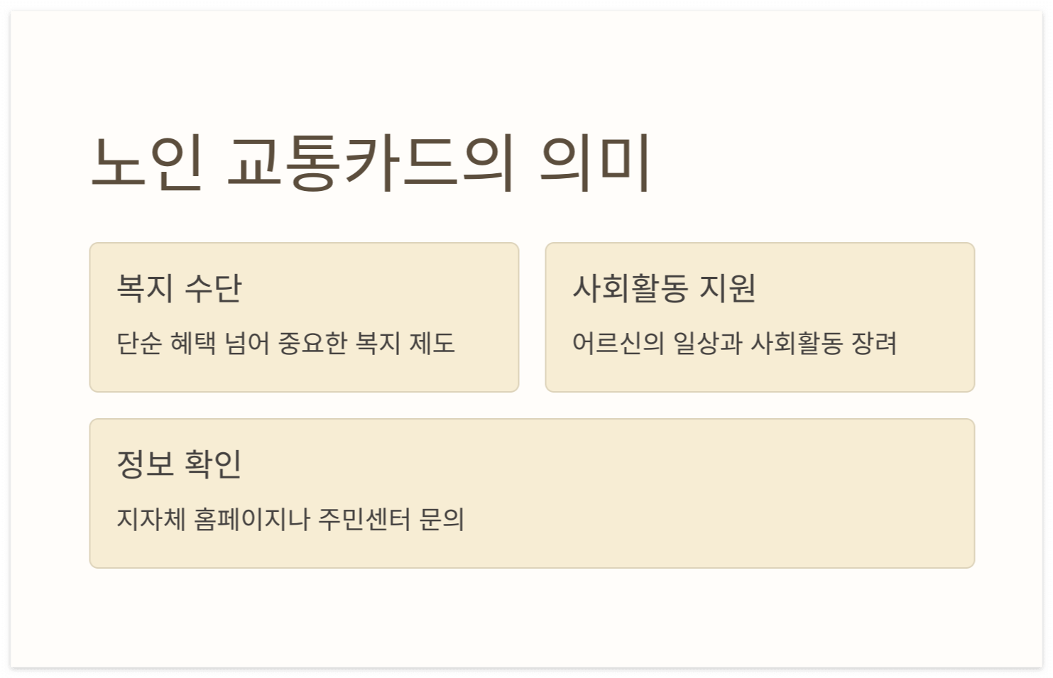 노인 교통카드 제도는 단순한 혜택을 넘어, 어르신의 일상과 사회활동을 지원하는 중요한 복지 수단입니다.