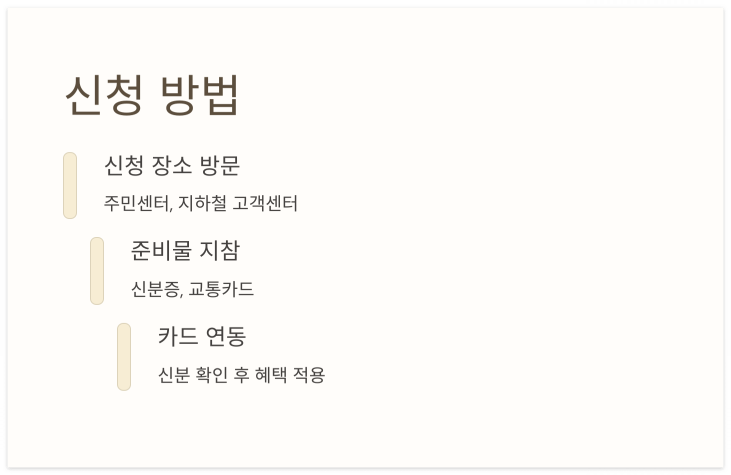 신분 확인 → 카드 연동 → 교통복지 혜택 적용 → 즉시 사용 가능