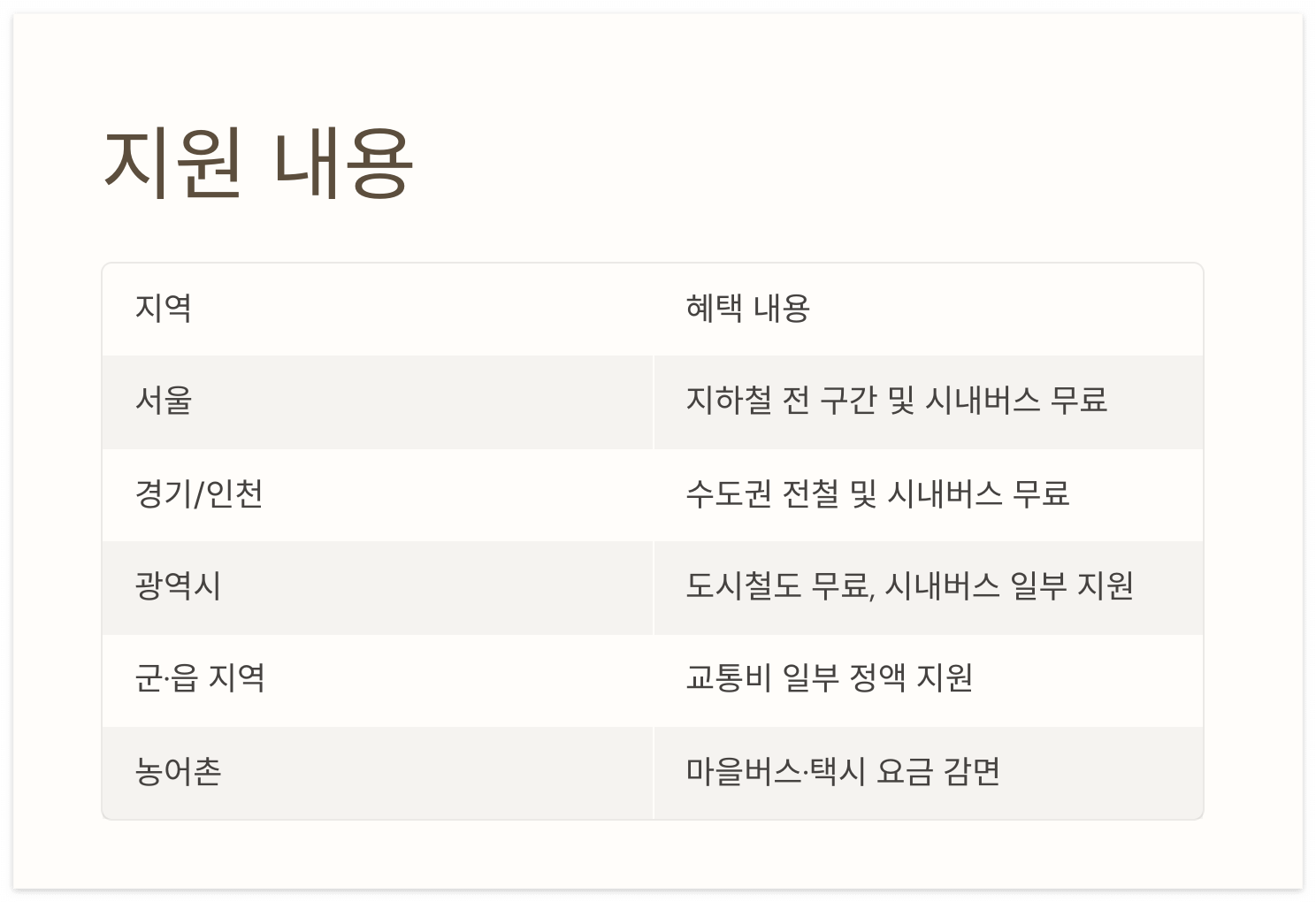 | 혜택 | 지역별 지하철/버스 무료 또는 요금 할인 |