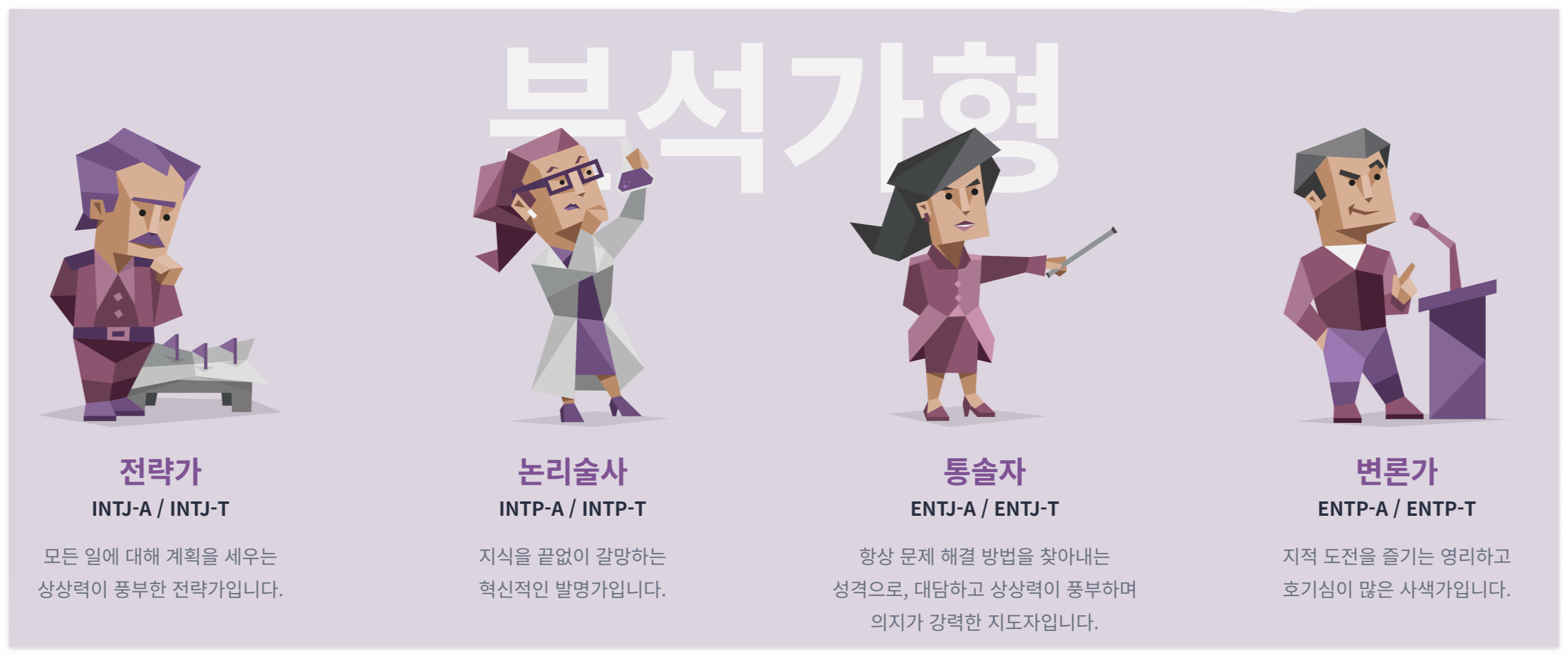 - INTJ – 전략가형: 독립적이며 목표 지향적인 계획가